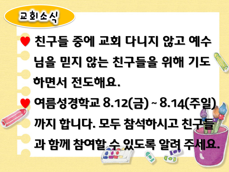 예배/예배 PPT 2022년 8월 7일 주일학교예배 PPT (교회학교예배PPT, 어린이예배PPT, 학령기예배PPT, 유초등부예배PPT) 하나님께 올인 2022. 8. 7. 08:09 주일학교예배(20220807).pptx 3.43MB 저작자표시 비영리 동일조건 (새창열림)